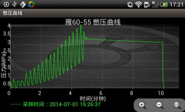 机采井智能憋压诊断仪可以是把数传压力表录取的井口油压数据通过通讯线实时地传递到机采井憋压曲线测试仪上,在显示器直接显示憋压数据和曲线。通过编制的软件将油井开机憋压和油井停机憋压数据放到同一坐标轴下对比,使操作人员直观地了解油井井下泵的工作状态。同时通过专业技术人员给定的憋泵标准,可直接判断出泵况问题原因。将显示器上存储的数据和曲线通过USB接口上传到计算机上,可显示更精细的数据点,以便做更进一步的分析、判断,可更好的分析井下油泵工作状况。 图1 憋压测试界面 上位机软件主要功能 : (1)上位机软件主要功能:机采井实时工况分析诊断,定量计算油井的漏失量。